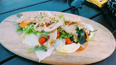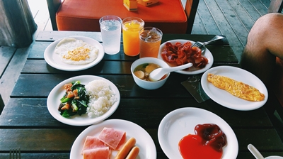 หลังจากถ่ายรูปรอบๆร้านอาหารของรีสอร์ท รอผู้ร่วมทริปเล่นน้ำเสร็จ ก้เริ่มหิว จึงลองสั่งอาหารมาทาน