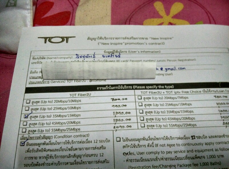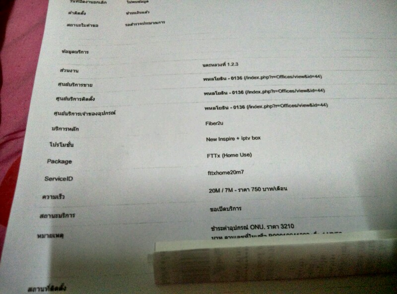 แต่ผ่านไปถึงวันที่ 18 มีเจ้าหน้ามาเดินสายให้แต่ยังไม่ได้ติดตั้งโมเดมให้ และได้แจ้งว่าวันที่ 18-19 จะมีพนักงานมาตั้งให้ แต่ถึงวันที่ 19 ตอนเย็นก็ไม่มีมาเลย และได้โทรสอบถามไปยังศูนย์ในพื้นที่ ก็ได้ความว่าติดงานติดตั้งใหญ่เลยยังติดให้ไม่ได้วันนี้ ก็รอจนถึงวันนี้ 21 ผมก็ได้โทรไปอีกครั้ง และได้ความว่าจะติดตั้งให้วันนี้หรือพรุ่งนี้ เมื่อถึงเวลา 10 โมงก็มีพนักงานติดตั้ง แต่ได้อ่านเอกสาร ก็มึนตึบ กลายเป็น 20/7 พร้อมกล้อง TV ได้อย่างไร ในเมื่อสมัครในเว็บก็ 35/15 เอกสารก็ 35/15 แต่ใบงาน 20/7 พร้อมกล่องซะงั้น