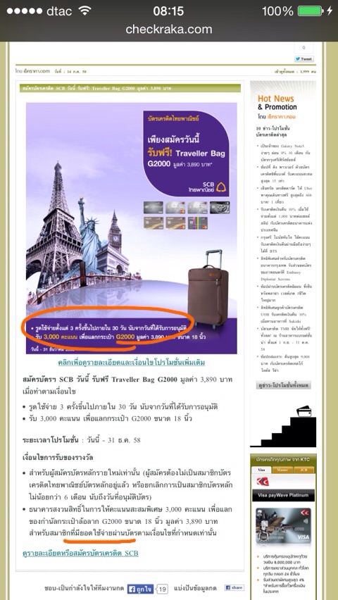 สมัครบัตรเครดิต SCB ตอนมีโปรแลกกระเป๋าเงื่อนไขคือรูดบัตร 3 ครั้ง ภายใน 30 วันหลังจากอนุมัติสามารถแลกกระเป๋าเดินทางได้ 1 ใบแต่พอครบเงื่อนไขโทรไปขอแลก กลับได้รับคำตอบของหมดชั่วคราว แต่ไม่รับจองล่วงหน้า