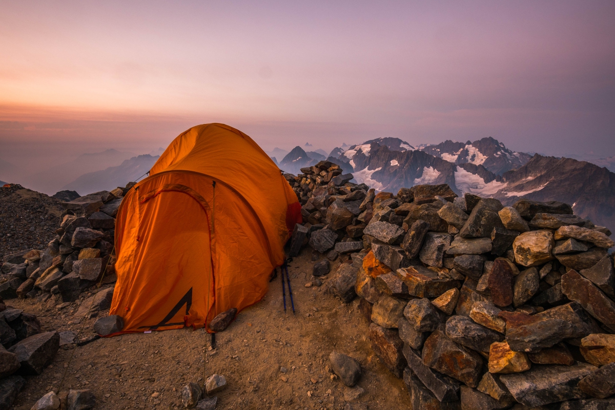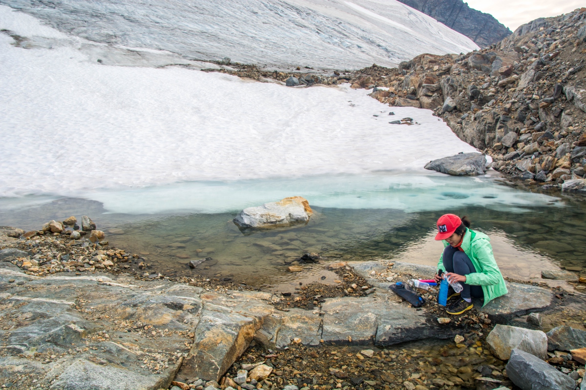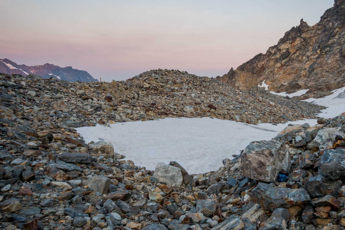 พวกเราก็รีบตั้งเต๊นท์กันกันก่อนที่จะมืด ลมข้างบนค่อยข้างแรงมาก ต้องยึดเต๊นท์ให้แน่นหนานะคะ จากนั้นเราก็ไปหาที่กินข้าวกันค่ะ เพื่อป้องกันสัตว์ป่า ที่ตั้งแคมป์เราจะต้องไม่มีกลิ่นอาหารเด็ดขาด ดังนั้นที่กินข้าว ที่ทำธุระส่วนตัว และที่ซ่อนอาหารก็ต้องห่างจากเต๊นท์ไปอย่างต่ำ 100 ก้าวค่ะ เราเลยเลือกไปใกล้ธารน้ำแข็งกัน เพื่อที่จะได้ทำธุระส่วนตัวกันด้วย เจ้าหน้าที่แนะนำให้ฉี่ลงไปที่ซอกหิน หรือ น้ำแข็งเท่านั้นนะคะ เพราะถ้าฉี่ลงพื้นทั่วไปสัตว์จะได้กลิ่นฉี่เราได้ จากที่มันติดค้างอยู่ในดิน หรือต้นหญ้า ส่วนอาหารของเรามื้อนี้ เป็นมาม่าต้มยำไก่ย่างน้ำคลุกคลิก (ลวกเส้นตั้งแต่ก่อนขึ้นมาค่ะ) เย็น และอืดนิดหน่อย แต่ด้วยความหิวโซ ก็กินหมดอย่างรวดเร็ว เราตัดสินใจไม่เอาอุปกรณ์ทำอาหารขึ้นมากัน เพราะกระเป๋าหนักมาก อยากจะลดภาระตัวเองให้ได้มากที่สุด