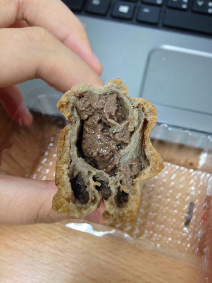 พอตอนเช้ามาจะกิน กัดมาคำแรก หื้มมมมมมมมมมมมมม คายทิ้งเลยจ้า เปรี้ยวมากกก เราก็เลยจัดการบิดดูข้างใน มันเป็นเมือกๆเหนียวๆ ตัวช็อกโกแลตก็จับกันเป็นก้อน ตามรูป