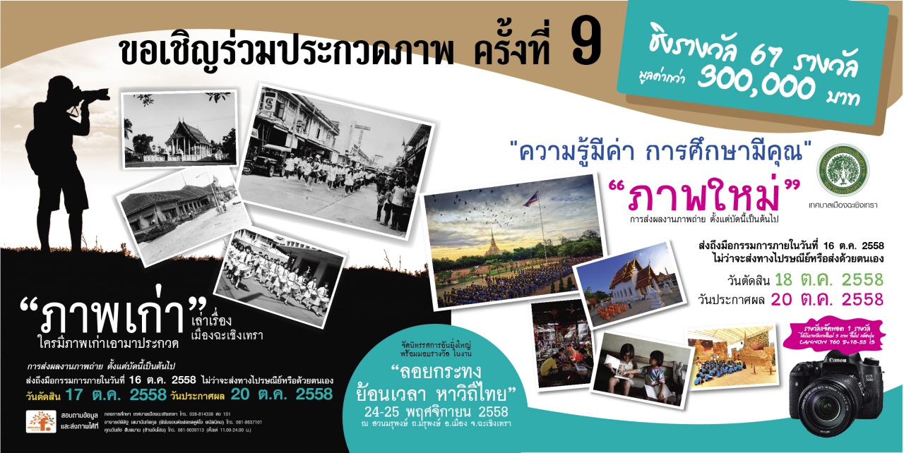 ขอเชิญร่วมประกวดภาพถ่ายของเทศบาลเมืองฉะเชิงเทรา หัวข้อ "ความรู้มีค่า การศึกษามีคุณ" หมดเขตวันที่ 16 ต.ค. 2558 ครับ
