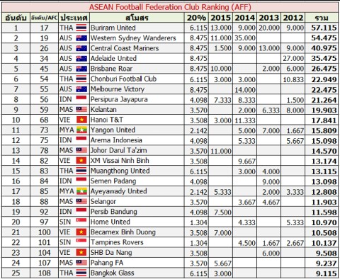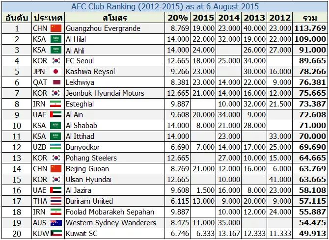 จัดอันดับ สโมสรฟุตบอลเอเชีย afc club
