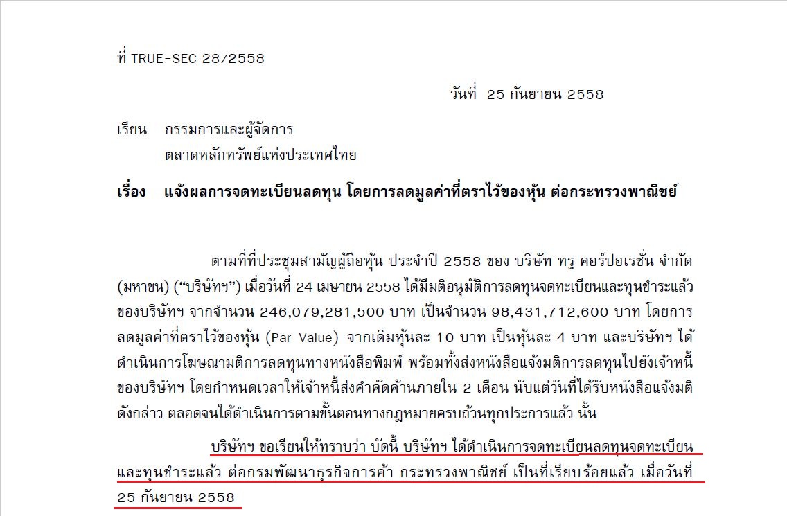 TRUE ลดพาร์เรียบร้อยแล้วนะครับเมื่อวันที่ 25 ก.ย.58 ตอนนี้ไม่มีขาดทุนสะสมแล้วละครับ