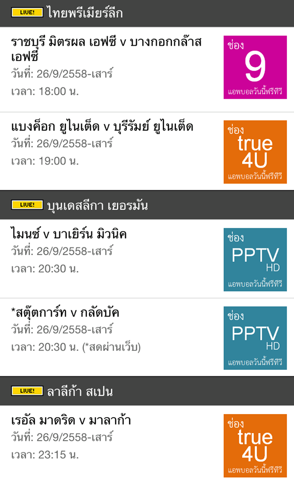 โปรแกรมถ่ายทอดสดฟุตบอลทางช่อง PPTV สัปดาห์นี้