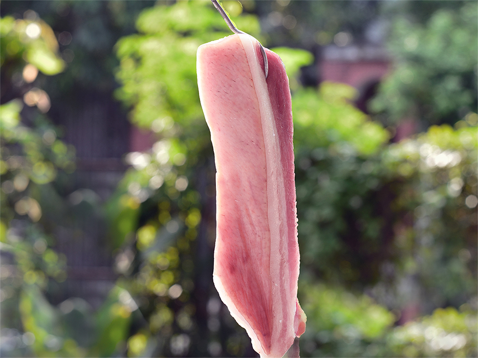 ก่อนจะเป็นหมูกรอบ แขวนกลางแดด ตากแดดนั่นแหละ ให้แห้ง เล็บเคาะหนังดังก๊อกๆ