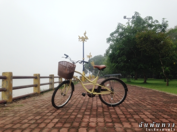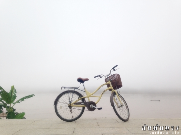 ด้านหลังมีเส้นทางจักรยานเลียบแม่น้ำโขง ตอนเช้าคนมาเดินเล่นออกกำลังกายกัน เราก็ไม่รอช้า รีบไปเช่าจักรยานมาปั่น