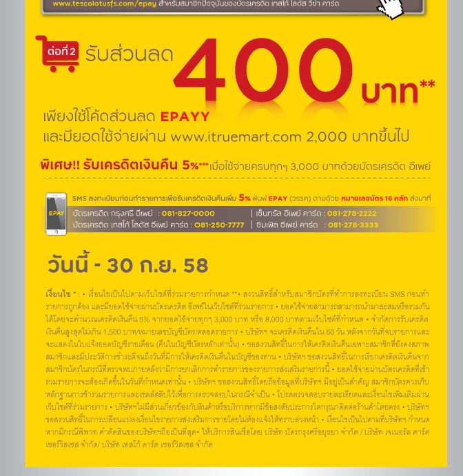 http://www.itruemart.com/ ทุกอย่างปกติเกือบทั้งหมด ติดอยู่อย่างเดียว ตรงกรอกรหัสส่วนลดที่แจ้งว่าลด 400ที่พิมพ์ว่า EPAYY ลองพิมพ์ไปแล้วมีข้อความแจ้งว่า ไม่ร่วมรายการ คือตั้งใจอยากจะได้ส่วนลดอยู่แล้ว อยากให้ทาง True intelligence แจ้งเหตุผลว่าทำไมไม่ได้ แล้วต้องทำอย่างไรถึงจะได้ ได้ชำระเรียบร้อยแล้ว (27/9/2015) โดยชำระผ่าน บัตร Krungsri Card Epay