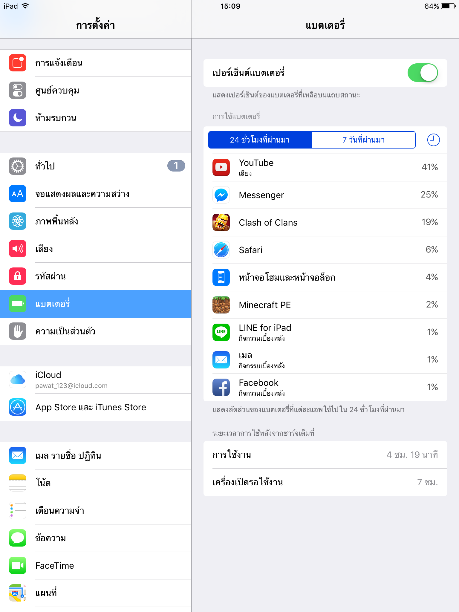 ipad gen8 อายุประมาณ 2 ปี ครับ แบตจะลดเอง ทั้งๆที่ไม่ได้ใช้งาน จะเปิดโหมดเครื่องบินไว้ตลอดเวลาไม่ใช้งาน บางครั้งเปิดหน้าจอมาดู แบตเหลือ 20 กว่าเปอร์เซ็นต์ จาก 50 กว่าเปอร์เซ็นต์ เปิดดูการใช้งานแบตตรงก
