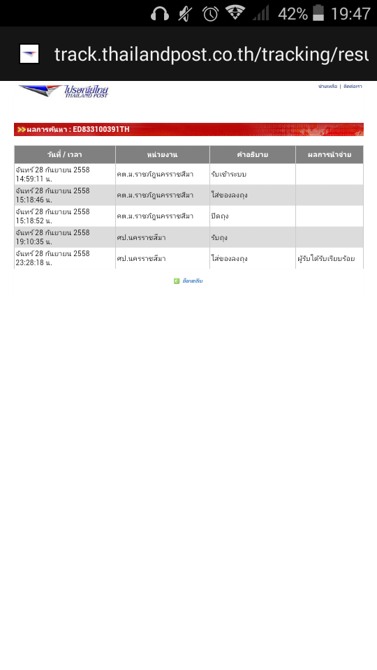 ซื้อของทางอินเตอร์เน็ตค่ะ เช็คเลขบอกรับเข้าระบบวันจันทร์ 23/3/15 ที่ มักกะสัน ตอน 11.45 ปิดถุงตอน 17.00 เมื่อวาน 24/3/15 9 โมง เตรียมการนำจ่าย พอเย็นๆ เช็คอีกที บอก นำจ่ายใหม่ คือที่จ่าหน้าซองไปเป