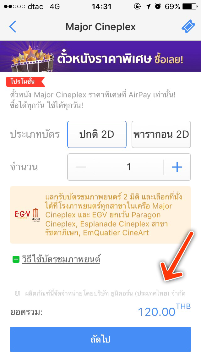 อยากสอบถามว่า ผมใช้ แอพ major กับ แอพ airpay อยู่ ในแอพเมเจอร์ เวลาซื้อตั๋ว มันราคา180บาท แต่ในแอพ แอร์เพย์ นี่120ทุกเรื่องเลย แบบนี้ถ้าซื้อผ่านแอพแอร์เพย์ จะใช้ตั๋วได้กับหนังทุกเรื่องเลยหรือเปล่าครับ หรือใช้ได้แค่เรื่องที่ไม่เกิน120 ตามรูปประกอบ