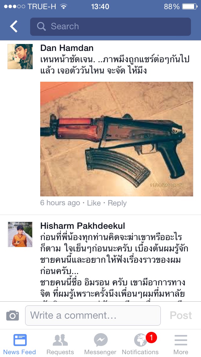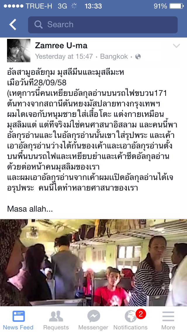 ผมมีรูป ส่วนคลิปหากันเองน่ะครับ บนรถไฟเจอคนนั่งทับอัลกุรอ่าน แต่ในคัมภีกลับมีรูปพระสง โดนลงมือนิดหน่อย แต่ประเด็น คือ คนcomment อย่างบ้าคลั่ง จะฆ่าบ้าง โชว์รูปปืนบ้าง บทสรุปคนคนนั้นเป็นคนไม่สมประกอบแต่นับถืออิสลาม