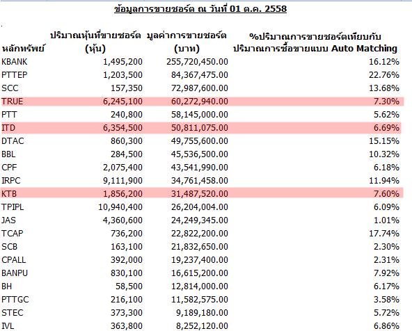ข้อมูลการขายชอร์ต (SBL) 20 อันดับแรก ณ วันที่ 30 ต.ค. 2558 อันดับ 1 PTT มูลค่า ~370 ล้านบาท Cr. https://www.facebook.com/GreenDiaryOfTrader/