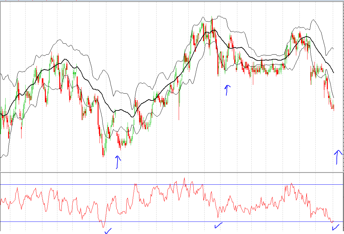 - ตอนที่ราคาหุ้นลงมา อยู่ในโซน oversold ต่ำๆและชิดขอบล่างของ bollinger bands ราคาก็มักจะวิ่งดีดขึ้นกลับไป