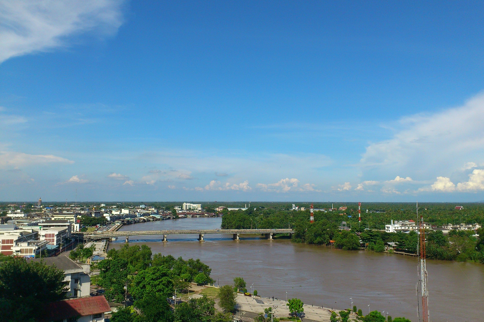 1) ตัวเมืองแปดริ้วมองจากสะพานข้ามแม่น้ำบางปะกง ลานริมแม่น้ำที่เห็นเป็นส่วนหนึ่งของลานพักผ่อนหย่อนใจที่ทอดขนานไปกับแม่น้ำยาวเกือบกิโลเมตร