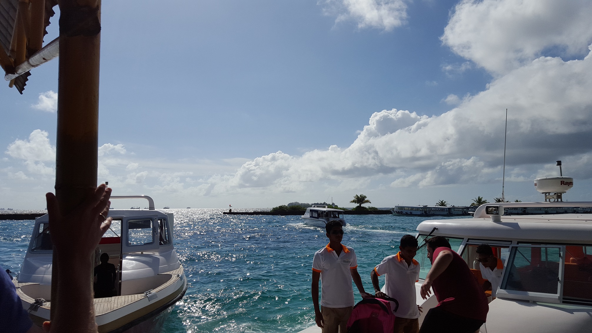 คนของ ทางโรงแรมจะมารอรับเราที่สนามบินแล้วก็นั่งเรือไปที่เกาะอีกประมาณ 20 นาที นั่งสบายๆครับเรือเร็ว คลื่นไม่สูงมาก ฟ้าสวยด้วย