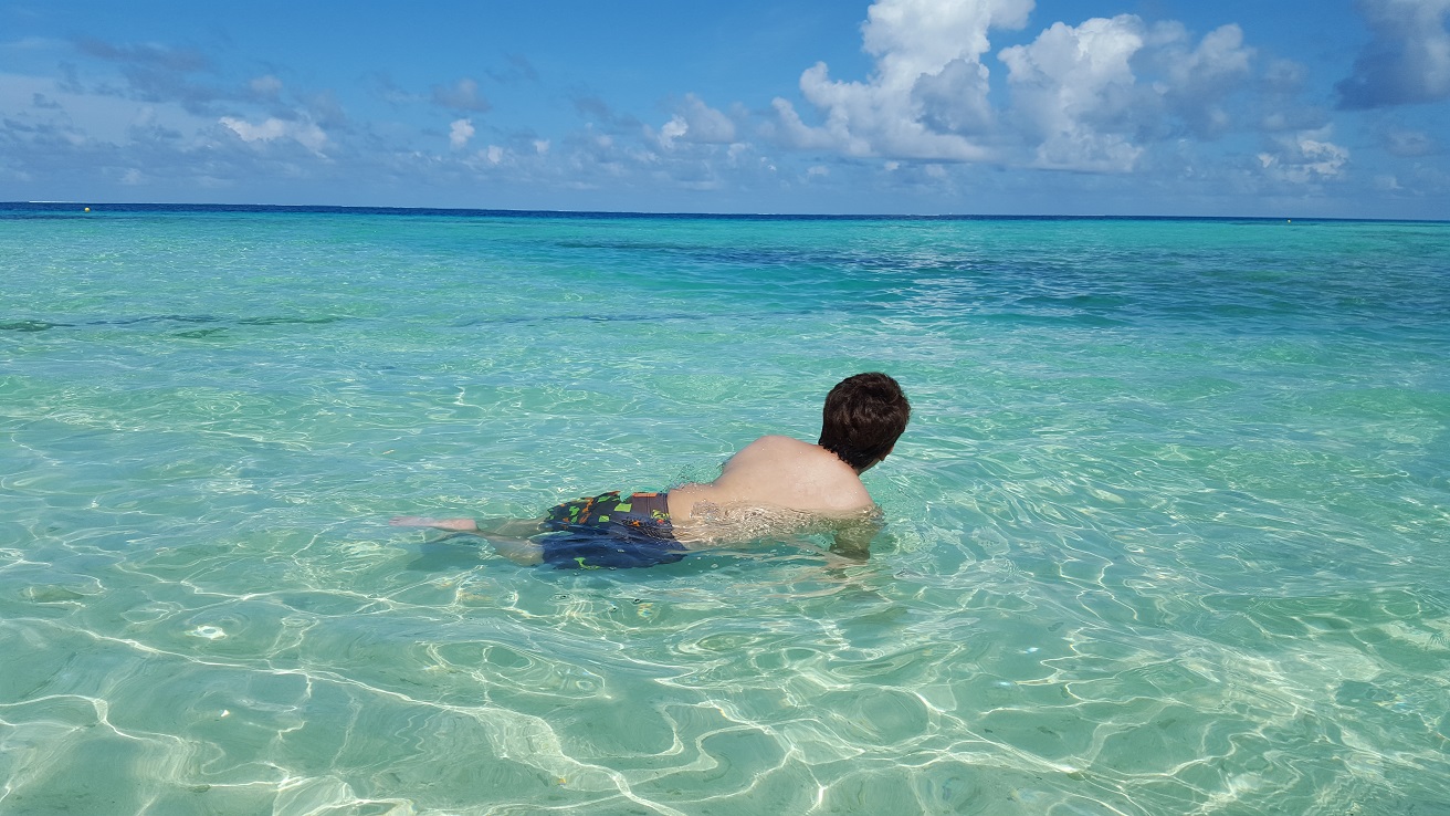ทางโรงแรมบอกว่าพื้นที่สีฟ้าคือน้ำตื้นประมาณ 1 เมตร ครับ แต่ถ้าเล่นไปไกลเกินถึงสีน้ำเงินจะเป็นเหวลงไปลึกมาก ก็อย่าเล่นไปไกลเกินพื้นที่สีฟ้าครับ ส่วน จขกท และคุณภรรยานั้น ว่ายน้ำไม่แข็งแรงทั้งคู่เลยไม่ต้องห่วงว่าจะไปไหนไกลฮะ