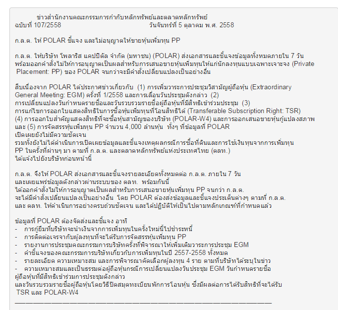 งานนี้เล่นกันเละ POLAR กล้าท้าทาย ก.ล.ต. ตกเย็น ก.ล.ต.สวดหมัดบวก หมดยกแรก เป๊งงง
