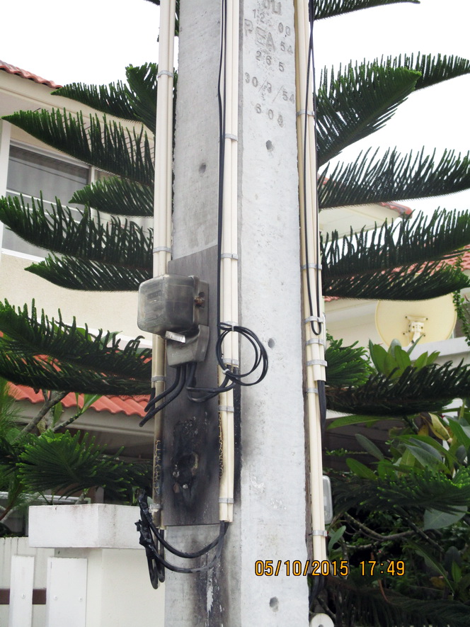 วันจันทร์ที่ 5/10/58 โทรตามอีกครั้ง เพราะไม่อยากไปที่ ที่ทำการของพวกเค้า ...(กลัว).... ดีนะ ที่ประมาณบ่ายโมงกว่า รถสีส้มก็วิ่งเข้ามา มาถึงก็กุลีกุจอ จัดการถอดมิเตอร์ออก แล้วก็พันสายไว้ อย่างที่เห็น อ้าว!!!! ไม่มีมิเตอร์มาเปลี่ยนเหรอครับ พวกเราถาม (ฉงน ปน งุนงง) "ใช้แบบนี้ไปก่อน เพ่..เดี๋ยวไว้เบิกของมาเปลี่ยนให้ " คำตอบที่เค้าบอก ช่างประทับใจพวกเราเป็นอันมาก เพราะได้ใช้ไฟฟ้า ฟรี ฟรี 55555555 "แล้วทำไมมันช๊อต ไหม้ล่ะ" ถามเพราะกังวล บ้านอีกหลังของเราที่ระยอง อยู่มา 20 กว่าปี ไม่เคยช๊อตเลย เค้าบอกว่า "สงสัยน้ำคงเข้า น่ะ" อ้อ!! หราาาาาาาา