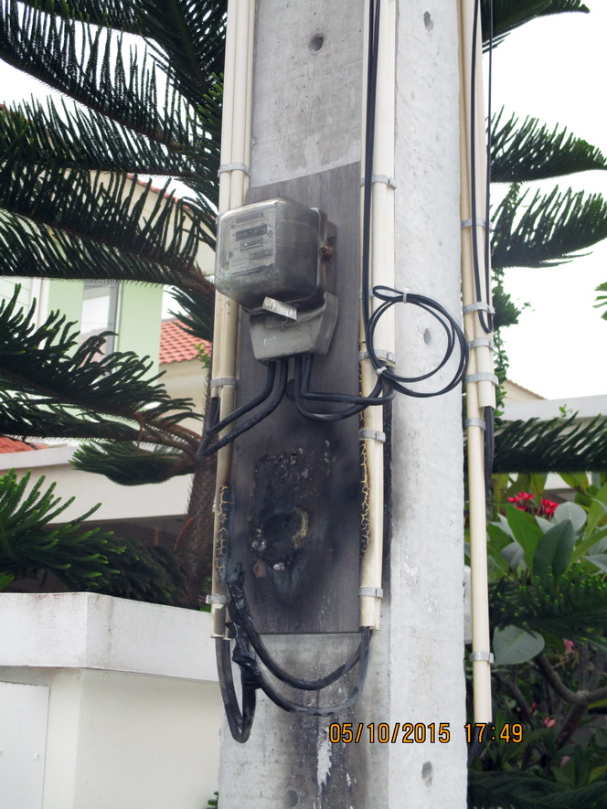 มิเตอร์ไฟที่บ้านเกิดระเบิดไฟไหม้ โดยไม่ทราบสาเหตุเมื่อช่วงบ่ายของวันเสาร์ที่ 3/10/58 ที่ผ่านมา ผมไม่อยู่บ้าน ดีที่เพื่อนบ้านเห็นและช่วยกันเอาถังดับเพลิงเล็กมาฉีด ดับไว้ได้ สภาพตามที่เห็น ตอนที่เค้าโทรไปบอก ตกใจ และบอกเค้าว่าในบ้านเอาคัทเอ้าท์ลงหมดแล้ว ไม่มีโหลดใดๆเลย มิเตอร์ช๊อตจนไหม้ ได้ไง?????
