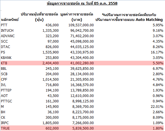 ข้อมูลการขายชอร์ต (SBL) 20 อันดับแรก ณ วันที่ 5 ต.ค. 2558
