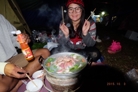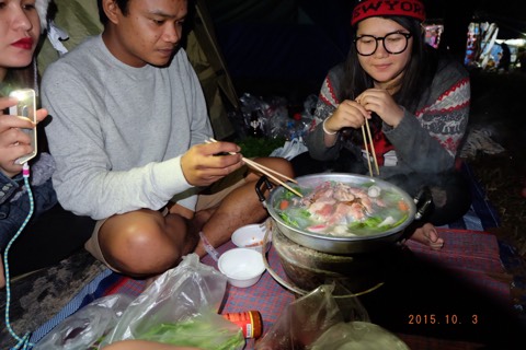 ตอนเราไปถึงอุณหภูมิ 19 องศา ฟินนนนนนนอ่ะ เพราะเราชอบอากาศแบบนี้ยุแล้ว เดินถ่ายรูปไปเรื่อยๆ เจอเด็กน้อยชาวดอยเราเลยถ่ายมาน่ารักมากเลยอ่ะ ถ่ายรูปเพลินๆจนท้องเรียกร้องว่า หิวววววว แล้วมองเวลาแม่เจ้า 6 โมงแล้ว เราก็เลยไปหาไรกินกัน บนภูมีร้านค้าเยอะมาก มีพวก ผลไม้ ผัก อาหารตามสั่ง แต่เราเลือกหมูกะทะ เราเลือกร้านอยู่ข้างๆห้องน้ำข้างบน มีเตา ถ่าน กะทะ ชุดละ 350 บาทให้ครบ แต่เรามีเตา ถ่าน ได้ส่วนลด 50 บาท ขอบอกเลยว่าหมูหมักอร่อยยยมากๆ มีไก่ทอดกับข้าวเหนียวด้วยนะ นั่งล้อมวงกินหมูกะทะกัน เมาท์มอยไปด้วย โดยมีหมู่ดาวเฝ้ามองเราอยู่อย่างฟินนนอ่ะ เผลอแป็ปเดียว เกือบ 3ทุ่มแล้วจร้า เลยรีบล้างหน้าล้างตาเข้าเต้นนอน ทะเลหมอกรอเราอยู่