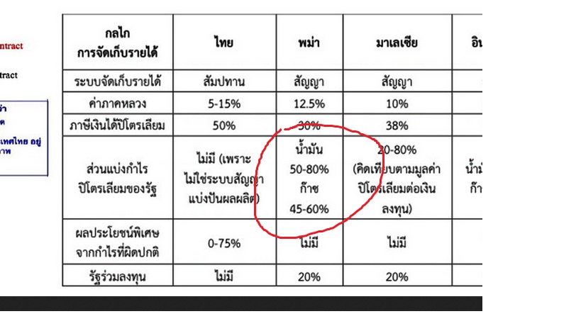 จากกำไร 20 บาท รัฐบาลพม่า ได้ 16 บาท บริษัททีขุด ได้ 4 บาท / คิดส่วนเเบ่งกำไร 80 เปอเซ็นตามภาพ /