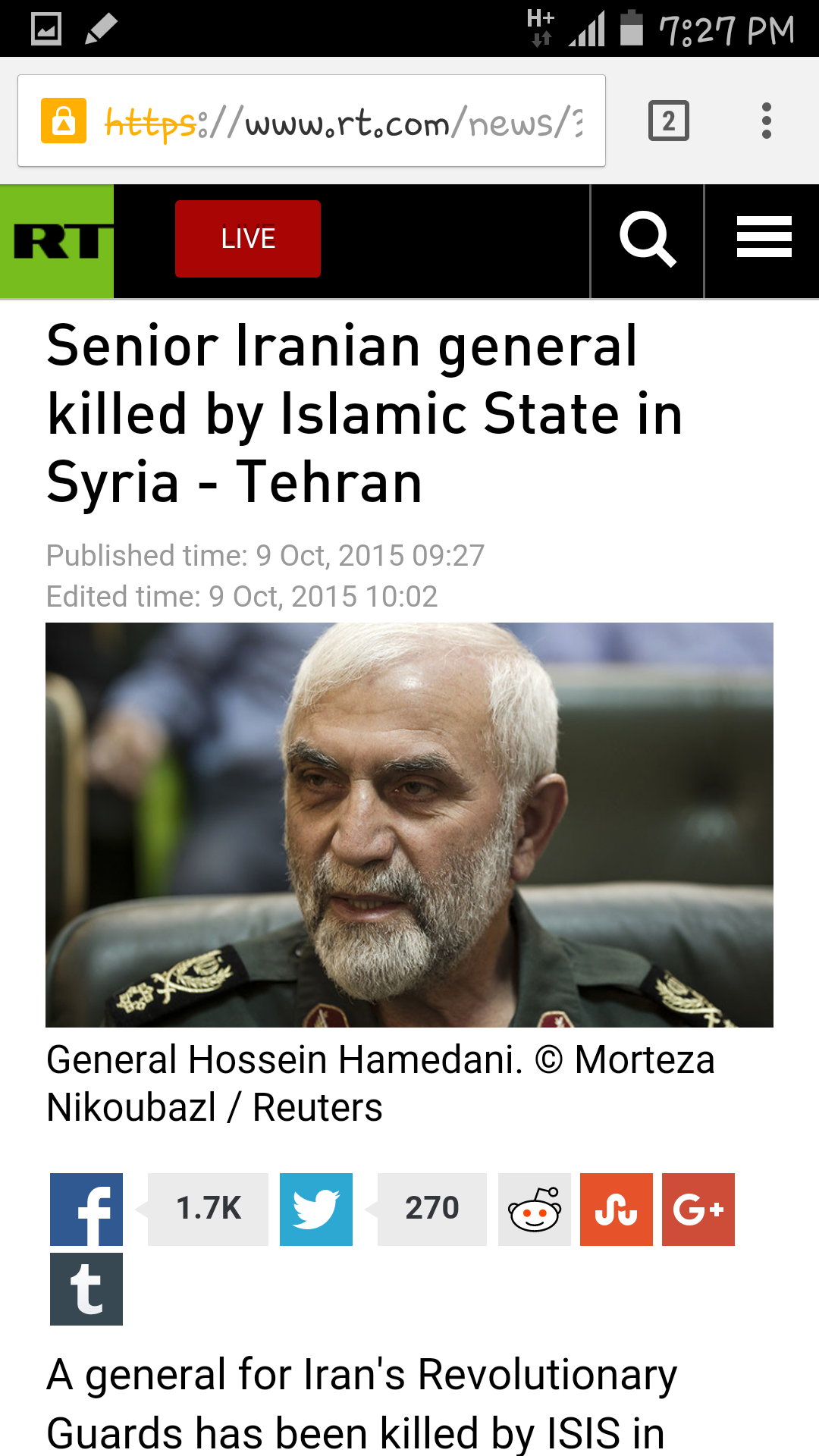จากที่อิหร่านได้ส่งทหารเข้าช่วยซีเรีย รบกับฝ่ายต่อต้านและ ISIS ตั้งแต่ปีที่แล้ว วันนี้มีรายงานว่า ท่านนายพล Hossein Hamedani ซึ่งว่ากันว่าท่านเป็นขุนพล ลำดับต้นๆของอิหร่าน และเป็นผู้นำของกองกำลังอิหร่านที่เข้าไปช่วยซีเรีย ได้เสียชีวิตลงแล้ว ระหว่างปฏิบัติการในภารกิจกวาดล้างกลุ่ม ISIS ทางตอนเหนือของ Aleppo