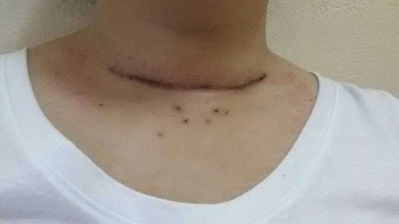 เราเป็นสาวโรงงานแห่งหนึ่งในจ.ขอนแก่น ได้มีประสบการณ์ต้องทำการผ่าตัดไทรอยด์ที่รพ.รัฐฯแห่งหนึ่งในจังหวัดนี้ ซึ่งเป็นเวลา 4 เดือนกว่าจะได้นัดผ่าตัด เราได้เข้ารักษาตั้งแต่วันที่ 29 กย.และทำการผ่าตัดวันที่ 30 กย.เราเข้าผ่ามารอที่ห้องผ่าตัดตั้งแต่ 11:00 ได้รับการผ่าตัด(ตอนรู้สึกตัวครั้งสุดท้ายตอนรมยาสลบ) 12:45 หมอน่าจะได้เริ่มผ่าประมาณ 13:00 (มโนเอาเองนะคะ) และรู้สึกตัวอีกครั้งตอน 19:30 ที่ห้องพักฟื้น และ 20:00 จึงได้ออกจากห้องพักฟื้น วันที่หมอมาเยี่ยมไข้วันแรก หมอบอกว่า เคสเราผ่ายากมาก และอยู่ลึก ก้อนใหญ่และมีหลายก้อน หมอยืนเมื่อยเลย เย็บทั้งหมด 18 เข็ม แผลยาวมาก