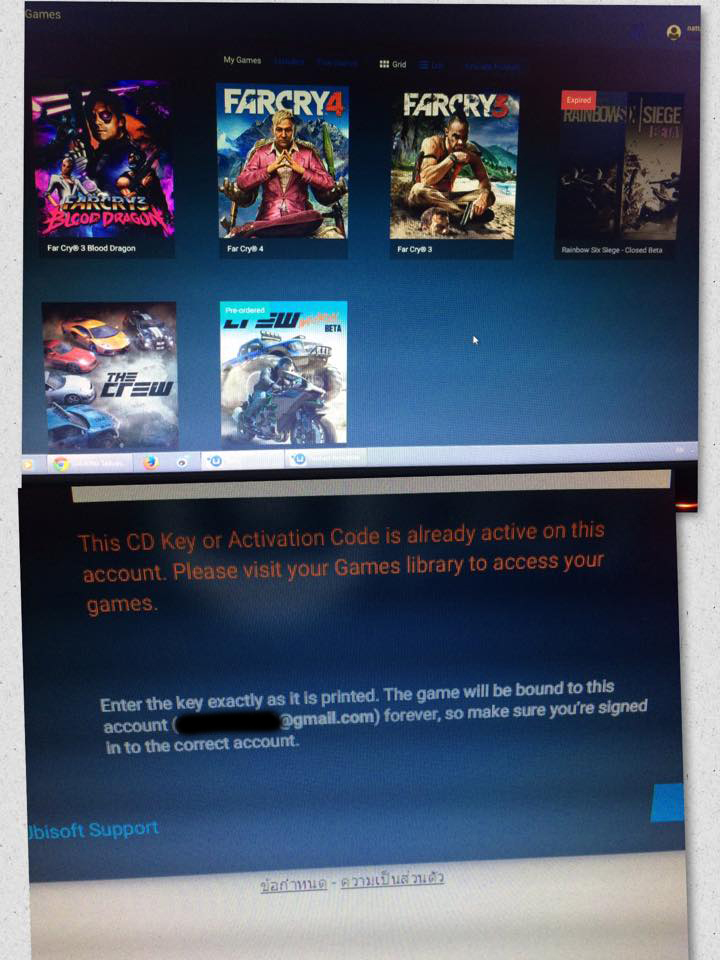คือผมมีปัญหาซื้อคีย์เกมมาลงใน Upaly .... assassin's creed unity ตอนกรอกคีย์ไม่มีปัญหา เเต่ปรากฎมันไม่ขึ้นหน้าเกมให้ดาวโหลดเหมือนเกมอื่นๆ ก็พยายามใส่คีย์เดิมอีกรอบ ปรากฎมันบอกว่ารหัสคีย์นี้อีเมลเราได้ถูกใช้ยืนยันไปเเล้ว ไม่อาจยืนยันซ้ำได้ งงซิ เกมก็ยังไม่ได้เล่นเลย ก็เลยส่งไปยังทีมงานยูบิซอฟเเจ้งปัญหา เเต่ไม่ทราบว่าได้คำตอบกลับมาเม่ื่อไหร่ ไม่ทราบว่าใครเคยเจอปัญหาในเกม UPLAY เเล้วส่งไปถามฝ่าย ubisoft support บ้างครับ ได้คำตอบกลับมาบ้างไหม เร็วรึเปล่า