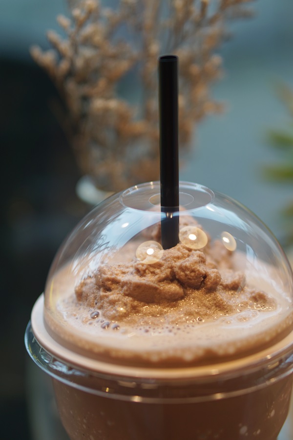 แก้วนี้เป็นโกโก้คาราเมลปั่น (55บาท) รู้สึกว่าโกโก้จะเข้มไปนิดนึงค่ะ แก้วนี้กินครั้งเดียว แล้วบอกลาเลย