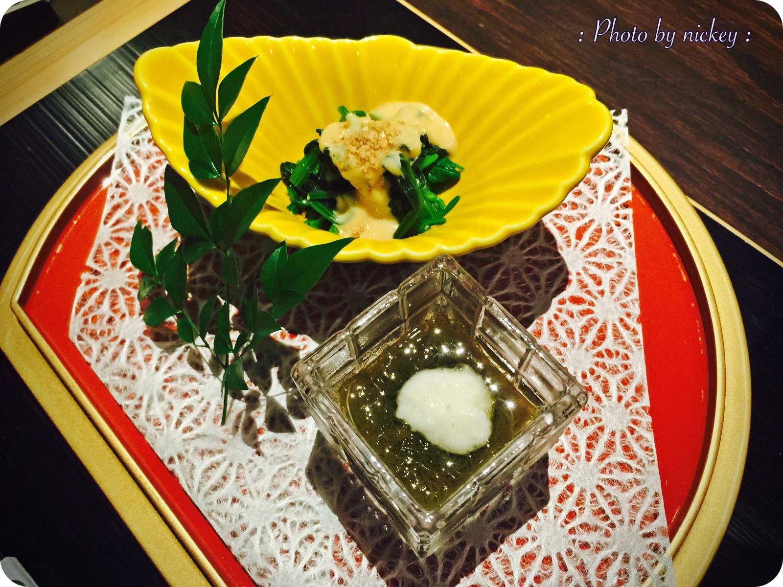 ตามมาลุ้นด้วยกันนะคะ .. จานแรก ' Amuse ' (Spinach with Sesame, Mozuku seaweed vinegar)