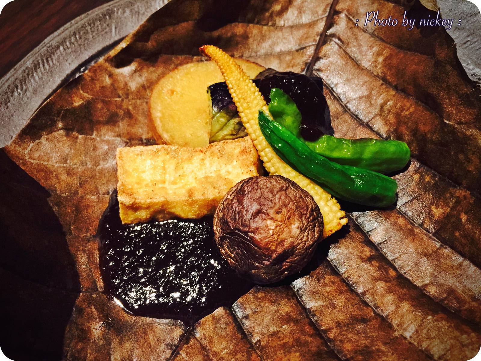 เมนูนี้หอมมากๆ เพราะเป็นผักต่างๆ ทั้งพริกหวาน เห็ดหอม เต้าหู้ มัน มะเขือม่วง ข้าวโพดอ่อน ย่างไฟบนใบโอบะ ราดมิโซะซอส ให้ 10 เต็มเลยค่ะ ชอบๆ
