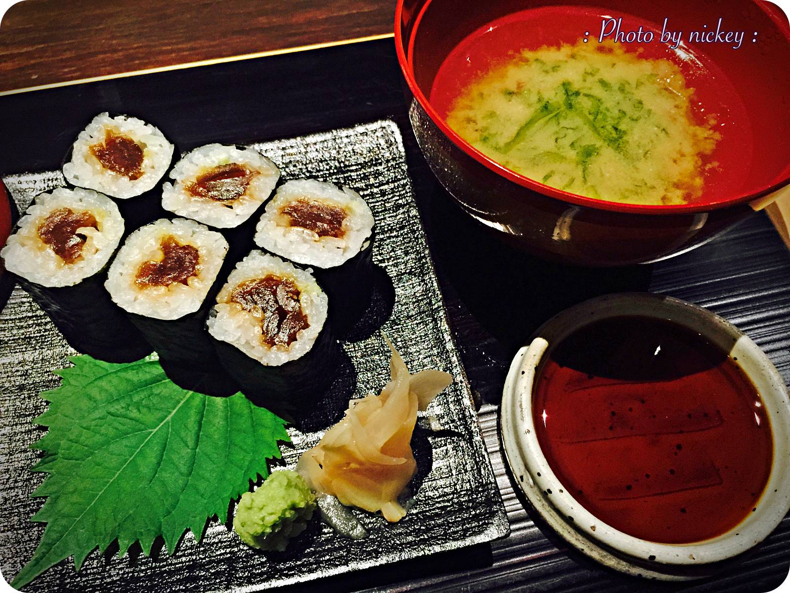 ซูชิเจ o_O".. อันนี้นิกเรียกเองค่ะ ไส้เป็น "คัมเปียว" เป็นผักคล้ายพวกฟักแฟงบ้านเรา รสชาติไส้หวาน ทานตัดกันไปมากับซุปสาหร่าย รสเค็ม