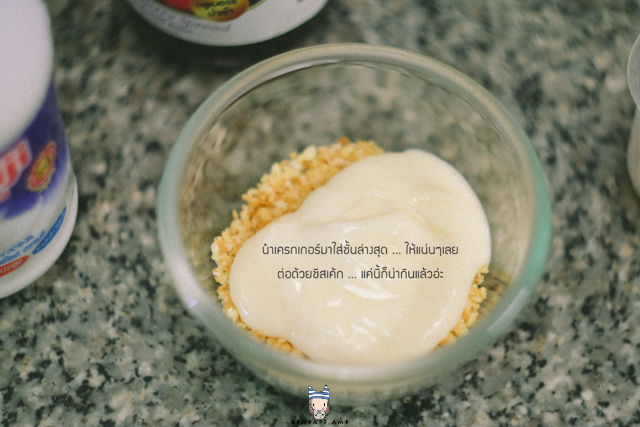 13.นำแครกเกอร์ใส่ถ้วยที่เราเตรียมไว้ ต่อด้วยชีสที่เราทำไว้เมื่อกี้ นำไปแช่เย็นให้แข็งตัว