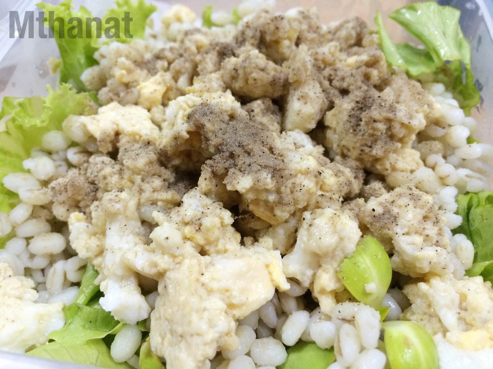 นำผักทั้งสองอย่างที่เราหั่นเตรียมไว้ และข้าวเบร์เล่ย์ต้มสุกแล้ว นำใส่ภาชนะตามที่ชอบ