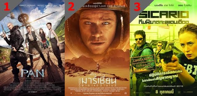 อันดับ 3 : Sicario หนังที่ถูกเสนอเข้าชิงรางวัล Palme d'Or ในเทศกาลหนังเมืองคานส์ที่ผ่านมา บอกเล่าถึงภารกิจของกลุ่มตำรวจกลุ่มหนึ่งที่บุกเข้าไปไล่ล่าแก๊งค้ายาเสพติดรายใหญ่ในเม็กซิโก โดยสอดแทรกรายละเอียดเกี่ยวกับปัญหายาเสพติดที่มีอยู่จริง และยังเน้นการนำเสนอมุมกล้องแบบ Bird Eye’s View ให้คนดูได้ชมกัน ถึงจะไม่ได้บู๊สนั่นเมืองแต่ก็มันส์สะใจพอสมควร