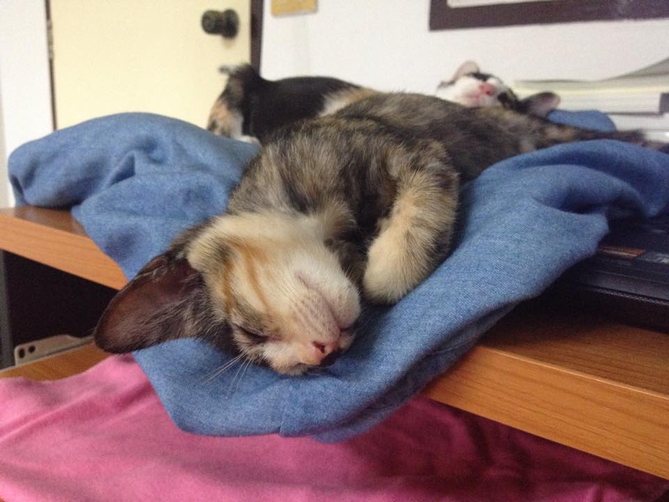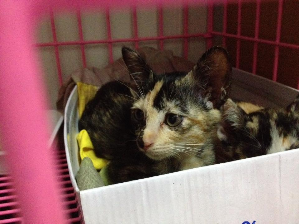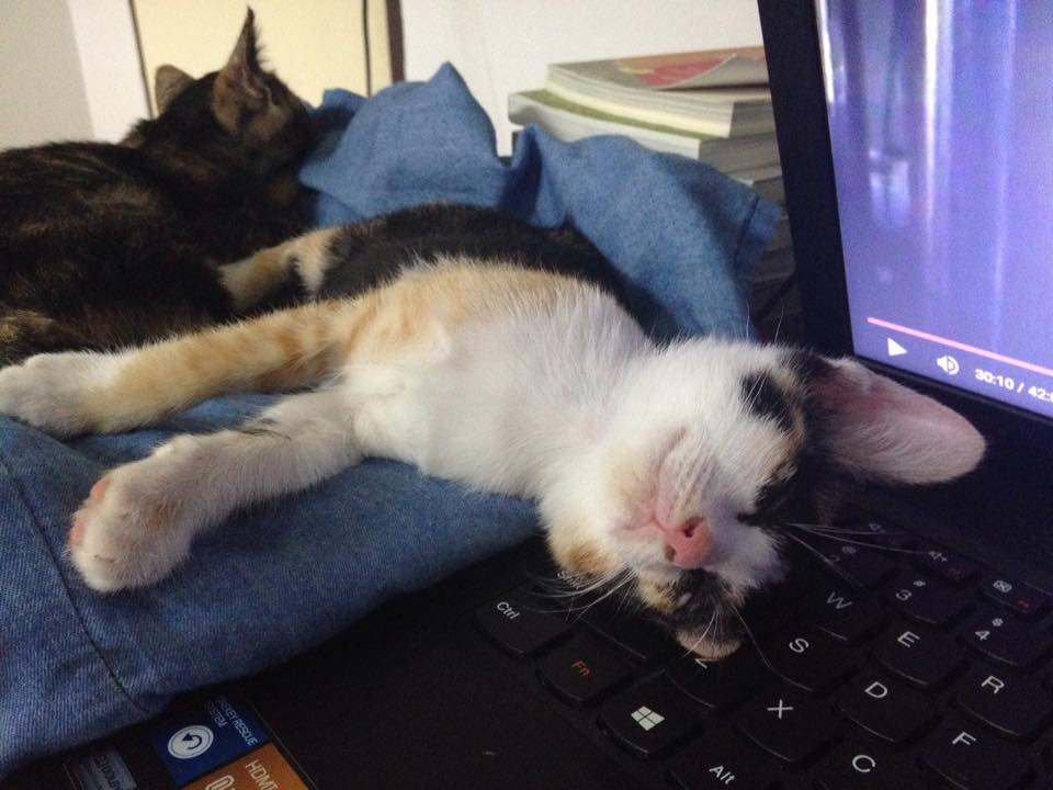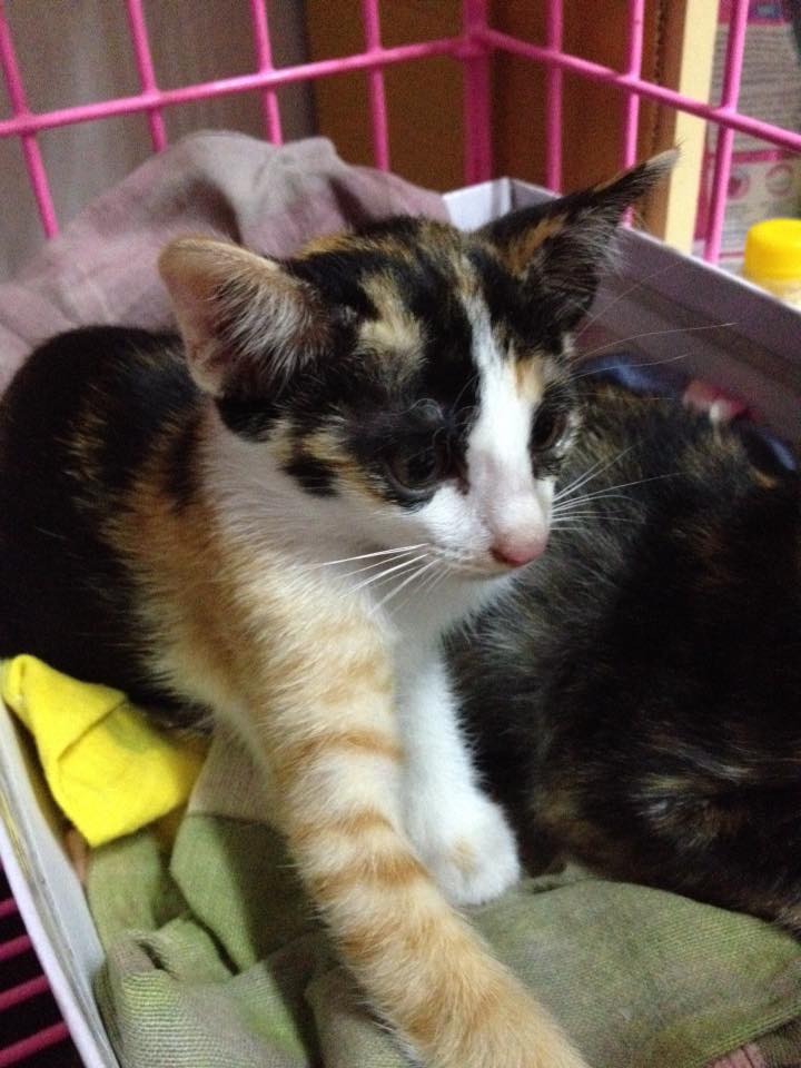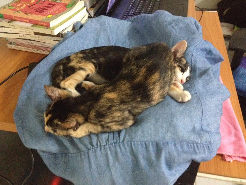 คือตอนเย็น เดินไปกินข้าว ระหว่างเดินไป เจอแมวเด็ก ร้องเสียงแหบๆ น่าสงสารมากๆ ขาดสารอาหาร เป็นหวัดอีก อุ้มกลับห้อง ข้าวปลาไม่ต้องกินมันแล้ว เริ่มคิดแล้วว่าคงต้องหาบ้านให้เจ้า 2 ตัวแรกก่อน ไม่งั้นเราจะแย่ เลี้ยงไม่ไหวแน่ๆ และเจ้า 2 ตัวแรก น่าจะหาบ้านง่ายกว่า