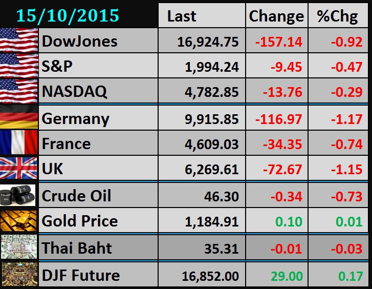 นอกจากนี้ ข้อมูลเศรษฐกิจที่อ่อนแอของสหรัฐยังส่งผลให้ภาวะการซื้อขายในตลาดหุ้นนิวยอร์กซบเซาลงเมื่อคืนนี้ด้วย โดยกระทรวงพาณิชย์สหรัฐเปิดเผยว่า ยอดค้าปลีกเพิ่มขึ้น 0.1% ในเดือนก.ย. เมื่อเทียบรายเดือน ซึ่งน้อยกว่าที่นักวิเคราะห์คาดการณ์ว่าจะเพิ่มขึ้น 0.2% ขณะที่กระทรวงแรงงานสหรัฐเปิดเผยว่า ดัชนีราคาผู้ผลิต (PPI) ร่วงลง 0.5% ในเดือนก.ย. เมื่อเทียบรายเดือน บ่งชี้ว่าอัตราเงินเฟ้อยังคงอยู่ในระดับต่ำ อันเนื่องมาจากการร่วงลงของราคาน้ำมัน และดอลลาร์ที่แข็งค่าขึ้น