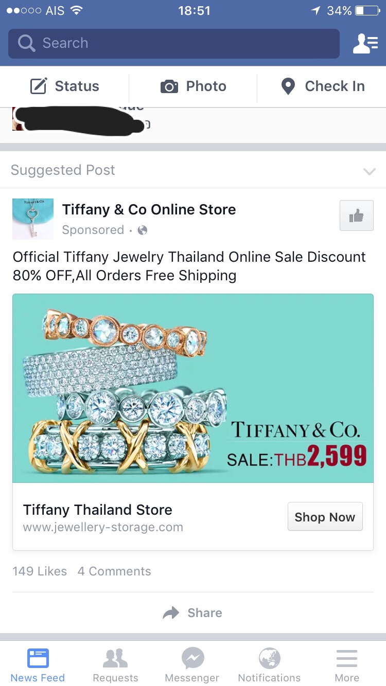 สวัสดีค่ะ วันนี้มีเรื่องมาเตือนภัยสาวๆกัน เนื่องจากเราเห็นโฆษณาในเฟซบุ๊ค แบบนี้ เนื้อหาประมาณว่า Tiffany & Co. ลดราคาถูกมากก ซึ่งรูปโปรไฟล์ ข้อมูลที่ลงเหมือนจริงมาก และทุกอย่างเป็นภาษาไทยหมด