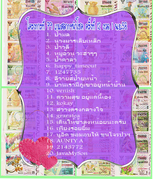 สรุปรายนามเพื่อนที่รับรางวัลโครงการ 79 สลากฯ นำโชคครั้งที่ 12 งวด 1 พ.ย. ทั้ง 20 ท่านได้แก่...