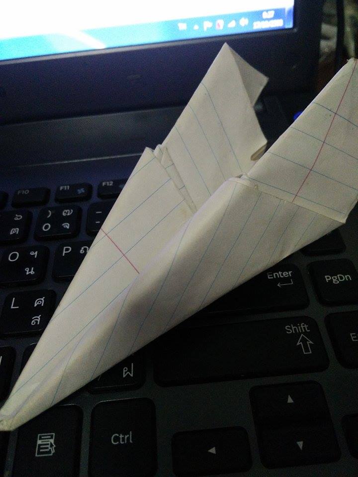 ) แล้วน้อง B ก็ก้มหน้าก้มตาทำอะไรสักอย่าง ซึ่งในตอนที่ฉันกำลังสงสัยอยู่นั้น จรวดกระดาษก็ร่อนมาตกใกล้ๆ ฉันก็เก็บขึ้นมาแล้วหันไปมองน้องเค้า (โอ๊ยรอยยิ้มกระชากใจอีกเเล้วค่ะ ^^) ชั้นก็ค่อยๆแกะ คลี่มันออก ในจรวดกระดาษ. . . ไม่ได้เขียนอะไรไว้หรอกค่ะ (จริงๆก็แอบคิดนะคะว่าจะมี T T แต่น้องเค้าคงเด็กไปที่จะโรแมนติกขนาดนั้น 555+) หลังจากนั้นฉันก็เลยทำปากเหมือนจะตะโกนบอก แต่แบบไม่มีเสียงนะคะ ฉันบอกไปว่า "จะส่งมาจีบทั้งที ก็เขียนข้อความมาด้วยสิ"
