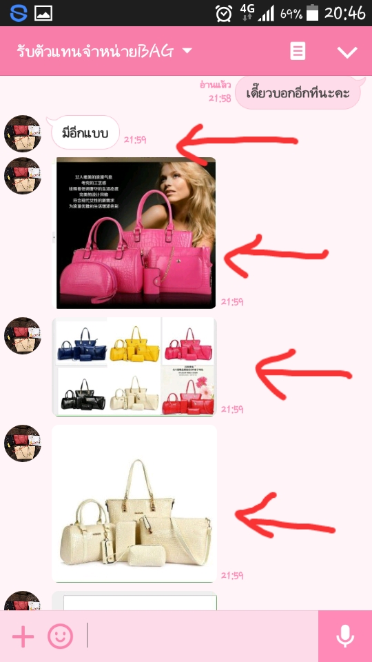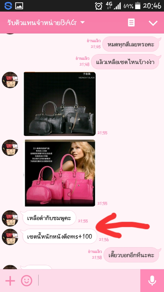 ต่อไปสังเกตรูปกระเป๋า เวลาและเนื้อหาที่เน้นในรูปนะคะ จะเห็นว่า เอ บอกว่า เหลือสีดำและสีชมพู