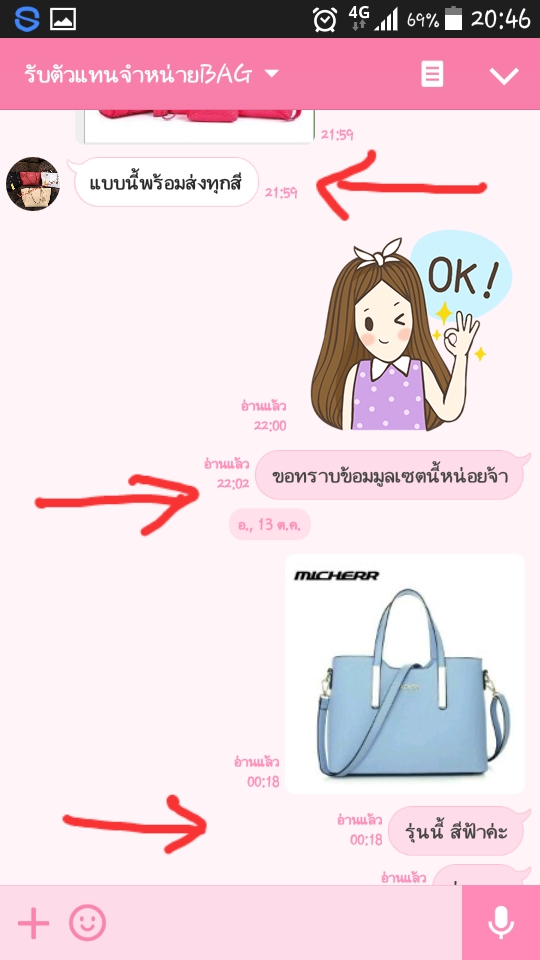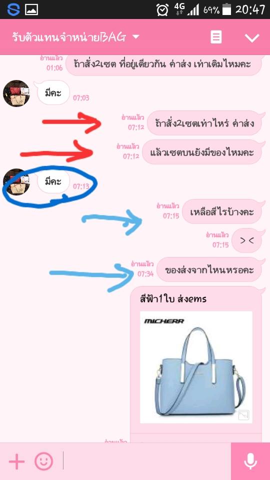 และบอกว่า พร้อมส่งทุกสี ระบุมาแค่นั้นจริงๆค่ะ จขกท.ขอทราบรายละเอียดสินค้า ก็อ่านค่ะแต่ไม่ตอบ โอเคไม่ว่ากัน จขกท.เลยเปิดหาข้อมูลจากไลน์ที่เคยโพสสินค้าของเอ พอเวลาผ่านไป จขกท.ทักไปสั่งสินค้าเพิ่มค่ะ กระเป๋า b berry แท้ สีฟ้า อีก1ใบ