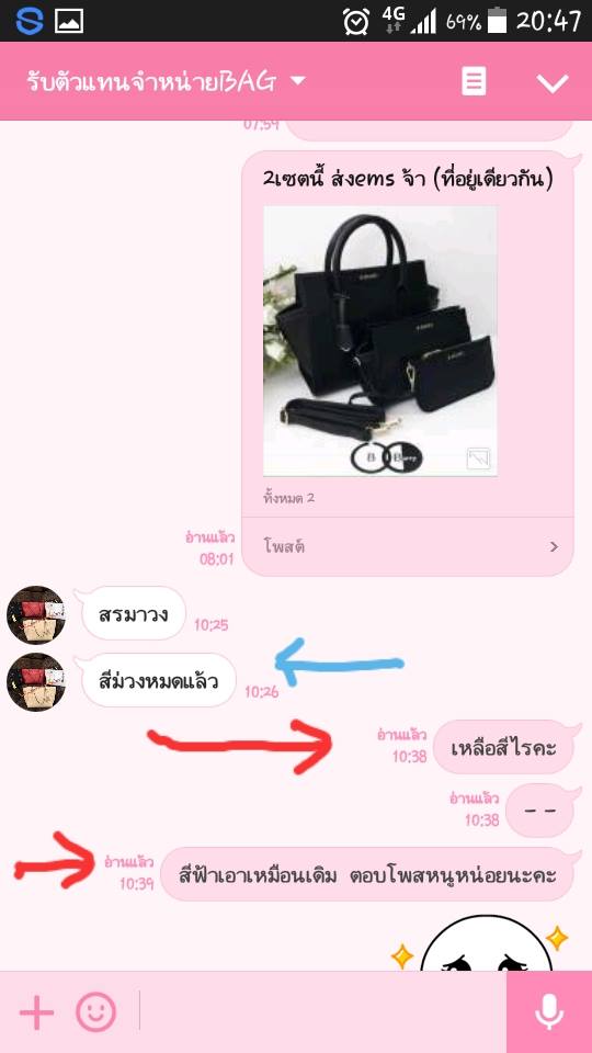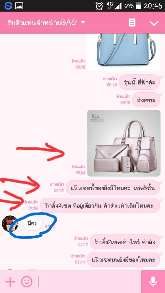 (รูปกระเป๋าเซตสีม่วง ที่เอตอบว่า "มีคะ" ก่อนหน้านี้) (ซึ้งตอนนั้นจขกท.ก็ตอบลูกค้าของตัวเองไปว่าสินค้ายังมีพร้อมส่ง ) ( แต่พอเอมาบอกว่าหมด จขกท.ก็งานเข้าสิคะ ต้องไปอธิบายลูกค้าอีกว่าสินค้าหมด เช็คสินค้าไม่ดี ทางร้านต้องขอโทษด้วย รับสินค้าเซตอื่นแทนไหม ลูกค้าก็น่ารักค่ะ เลือกเซตอื่นแทน )