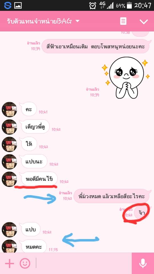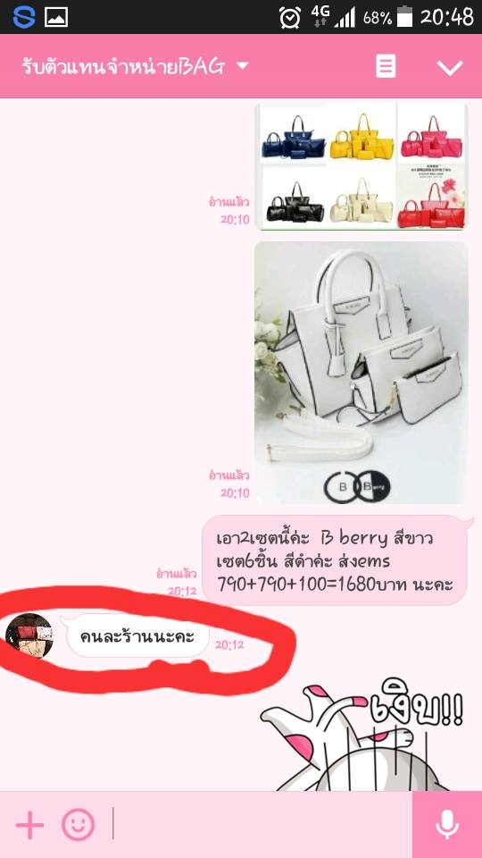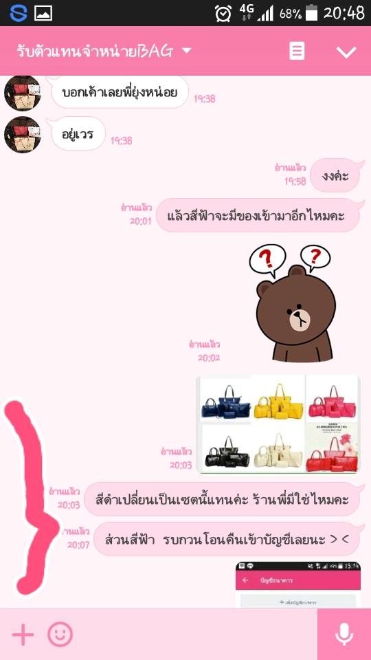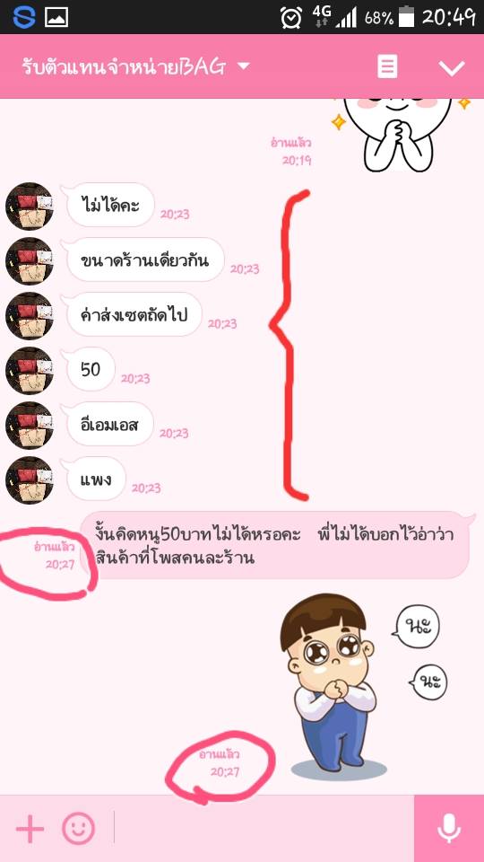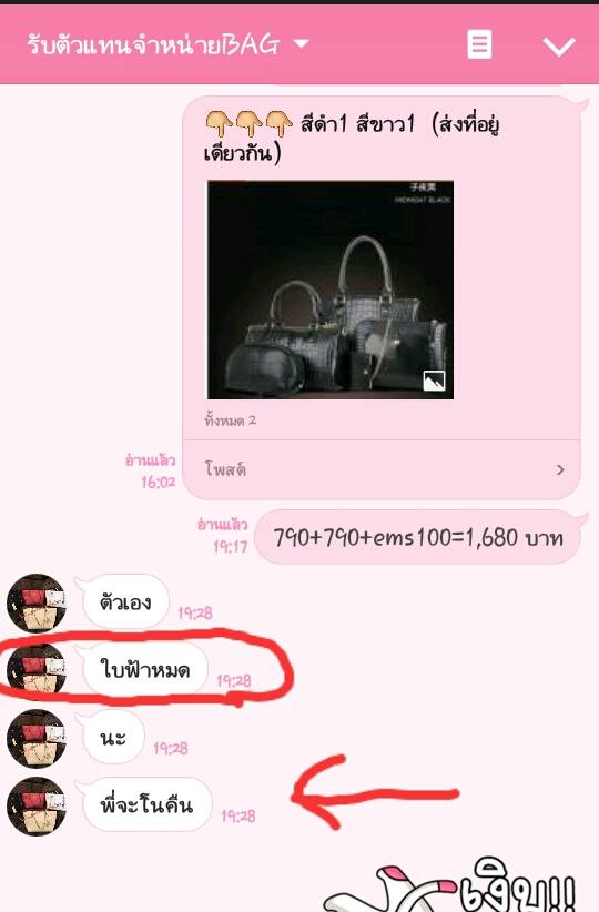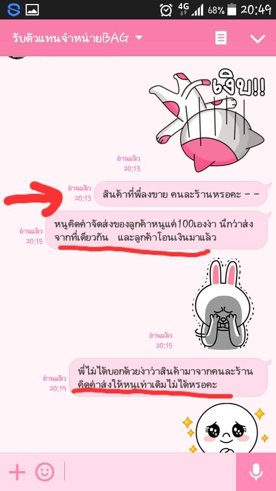 จขกท.ก็เข้าใจว่า เอ มีของแน่ พร้อมส่งทุกสี และเป้นสินค้าร้านตัวเอง แต่!!เกินปัญหาเดิมค่ะ สินค้าคนละร้าน ค่าจัดส่งแยก เงิบไปอีกแล้วจ้า สรุปคือ ลูกค้าของจขกท.ต้องเสียค่าจัดส่ง2ครั้ง แต่จขกท.ไม่อยากให้เสียเครดิตร้านค่ะ พยามพูดดีกับเอ ให้เข้า ว่าถ้าเพิ่มค่าจัดส่ง จขกท.จะขาดทุน (ในใจ จขกท.ไม่อยากบอกลูกค้าค่ะว่าต้องเสียค่าจัดส่งเพิ่ม เหตุเพราะสินค้าคนละร้าน เนื่องจากปัญหาที่พบมาข้างบนก็หลายรอบแล้ว ลูกค้าก็ยังไม่วีน) แต่ก็นั่นแหละคะ ถ้าเสียค่าจัดส่งเอง จขกท.ก็ขาดทุน เงินเข้าเนื้อตังเองค่ะ เพราะจขกท.เน้นกำไรน้อย เจาะจงปริมาณและความพอใจของลูกค้า* ก็พยามลองคุยกับเอ ว่าเหตุเกิดจาก เอไม่ยอมอธิบายและบอกรายละเอียดมาให้ชัดเจน ให้เอคิดค่าจัดส่งเท่าเดิมได้ไหม เอ ก้ตอบว่า ขนาดร้านเดียวกันค่าส่งเซตถัดไปยังต้องเพิ่ม50บาท ณ จุดนี้ จขกท.เข้าใจนะคะว่า เซตถัดไป อาจเพิ่มค่าส่ง แต่ต้องไม่ใช่เหตุการณ์นี้ สินค้าคนละร้าน แต่ไม่บอกก่อน (จขกท.ด้วยความอยากขายค่ะ ต้องการหาเงินและไม่อยากเสียเครดิตร้านไปมากกว่านี้ ) เลยยอมขาดทุนค่ะ ขอลดค่าส่งที่แยกออกมาให้ได้ไหม เหลือ50บาท แต่!!!! ไร้คำตอบค่ะ **เอ อ่าน ไม่ ตอบ**