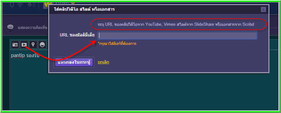 pantip รองรับการใส่ VDO ด้วยรูปแบบนี้ครับ (ดูในวงสีแดง ใน ภาพ ที่ผมวงไว้ครับ)