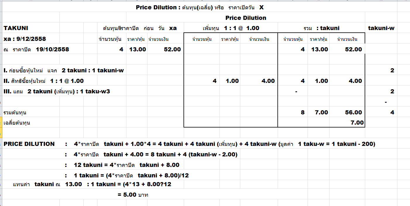 ตามหลักการ price dilution ราคา takuni ในกระดานจะมีผล dilution effect จากราคาหุ้นใหม่ต่ำกว่า และ ได้รับแถม takuni-w1 ฟรีๆ เฉลี่ยราคาในกระดาน ดังนี้