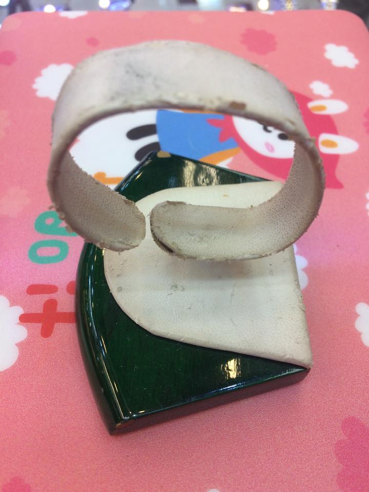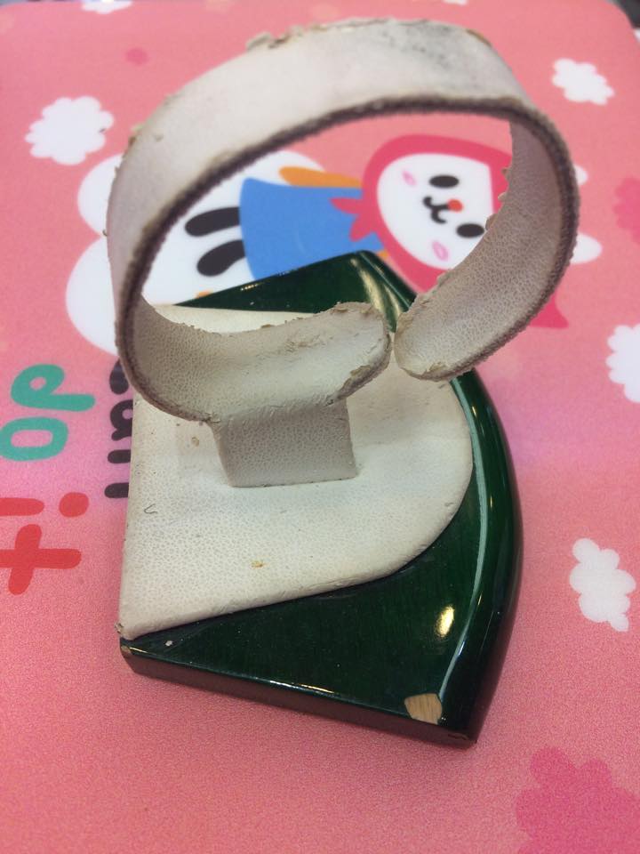 ตัวฐานเป็นไม้สีเขียวเงา และตัววางนาฬิกาเป็นหนังเทียมสีขาวครับ