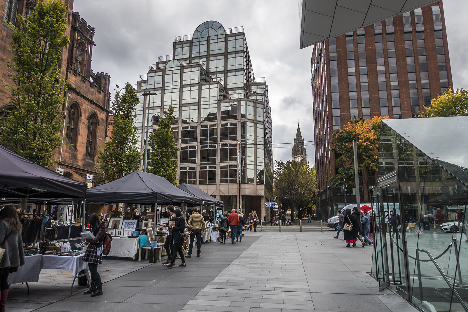 ตลาดนัดวันหยุดสุดสัปดาห์ที่ย่าน Spinningfields เป็นย่านธรุกิจของเมืองซึ่งสร้างมาโดยเฉพาะครับ โดยชื่อ Spinningfields มาจากสมัยก่อนที่ย่านนี้เป็นย่านที่มีโรงงานปั่นฝ้ายอยู่มาก ในย่านนี้จะมีสถาปัตยกรรมโมเดิร์นอยู่รวมกับสถาปัตยกรรมแบบกอธิคครับ ที่เห็นอยู่ไกลๆกลางภาพเป็นยอดของหอนาฬิกาของ City Hall ครับ